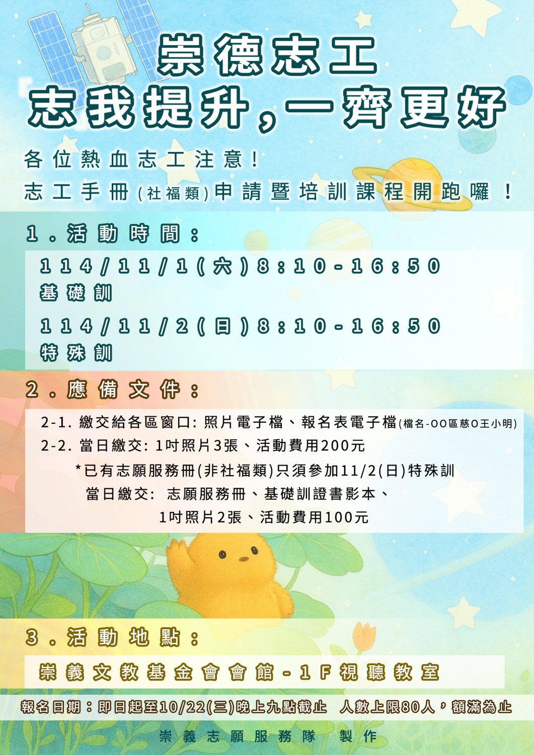 發佈標題 | 崇義志願服務隊 114年度志願服務人員志工基礎暨社會福利類志工特殊訓練 |