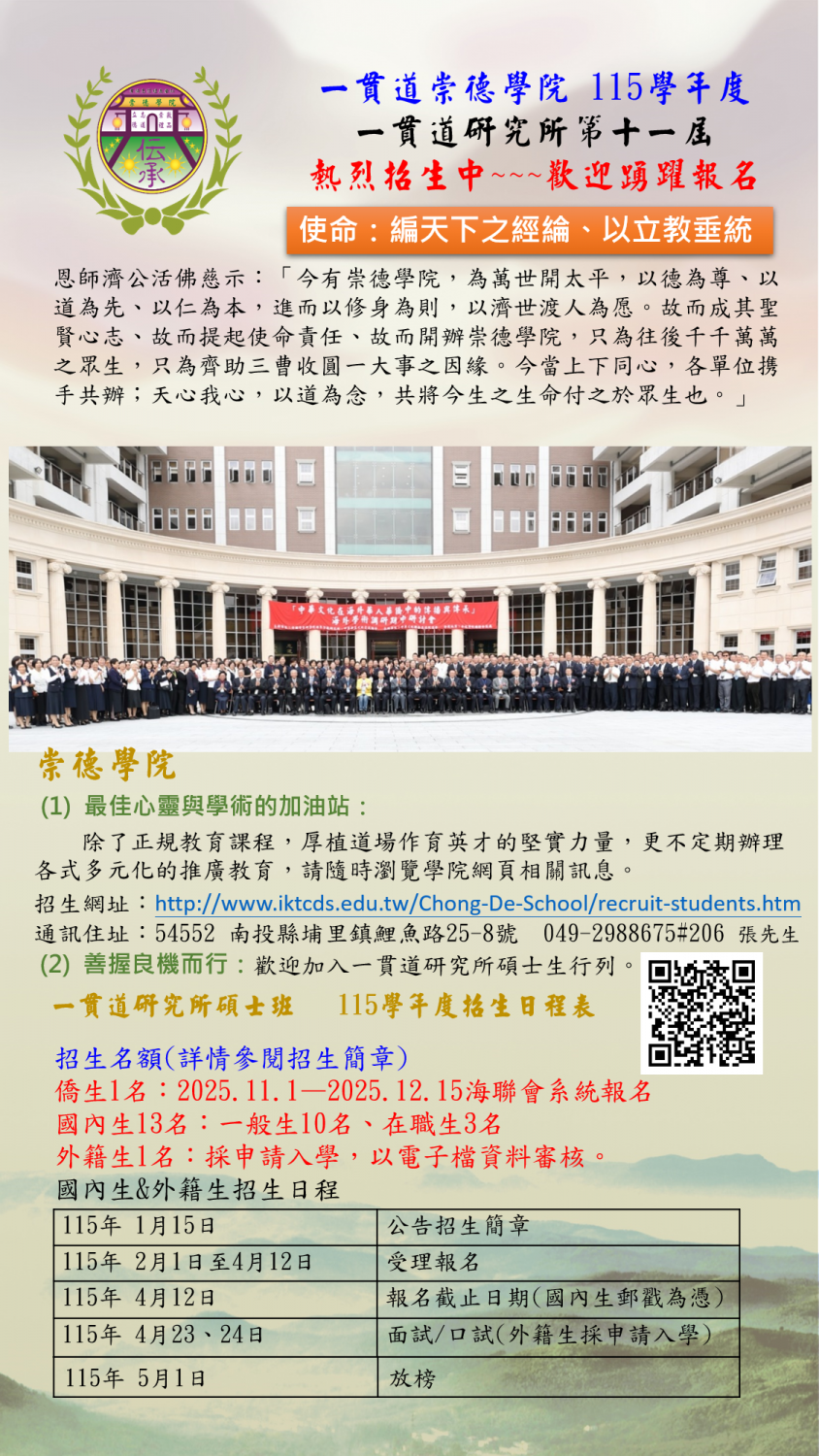| 發佈標題 | 一貫道崇德學院碩士班 115學年度一貫道研究所第十一屆招生中 |
