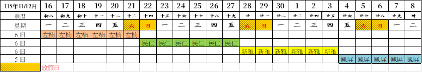 二、115年發一崇德道務中心假日接待服務輪值 1.115.7/4-5接待服務輪值6-1 左楠 2.115.7/11-12接待服務輪值6-2 民仁 3.115/7/18-19接待服務輪值6-3 新雅 4.115.7/25-26接待服務輪值6-4 鳳屏 5.115.8/1-2接待服務輪值6-5 左楠/民仁 6.115.8/8-9接待服務輪值6-6 新雅/鳳屏