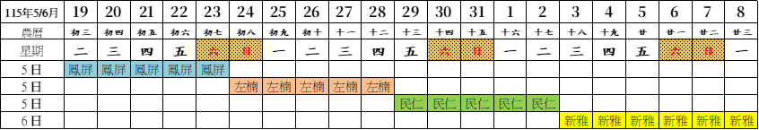 二、115年發一崇德道務中心假日接待服務輪值 1.115.7/4-5接待服務輪值6-1 左楠 2.115.7/11-12接待服務輪值6-2 民仁 3.115/7/18-19接待服務輪值6-3 新雅 4.115.7/25-26接待服務輪值6-4 鳳屏 5.115.8/1-2接待服務輪值6-5 左楠/民仁 6.115.8/8-9接待服務輪值6-6 新雅/鳳屏